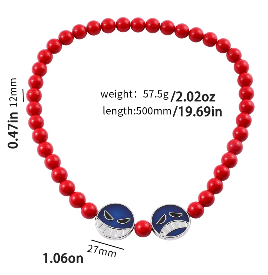 El collar tiene una longitud total de 500 mm (50 cm). Está diseñado para quedar a la altura del pecho, respetando la estética original del personaje Portgas D. Ace en el anime.